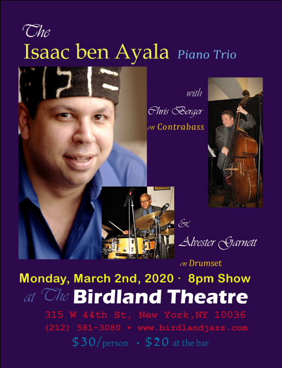 Isaac ben Ayala Trio at Birdland Theater Calendar Add to Calendar Add to Timely Calendar Add to Google Add to Outlook Add to Apple Calendar Add to other calendar Export to XML When: 03/02/2020 @ 8:30 pm – 10:00 pm 2020-03-02T20:30:00-05:00 2020-03-02T22:00:00-05:00 Where: Birdland Theater 315 W 44th St New York NY 10036 Cost: $30 / $20 at the bar Contact: Birdland Theater (212) 581-3080 Event website